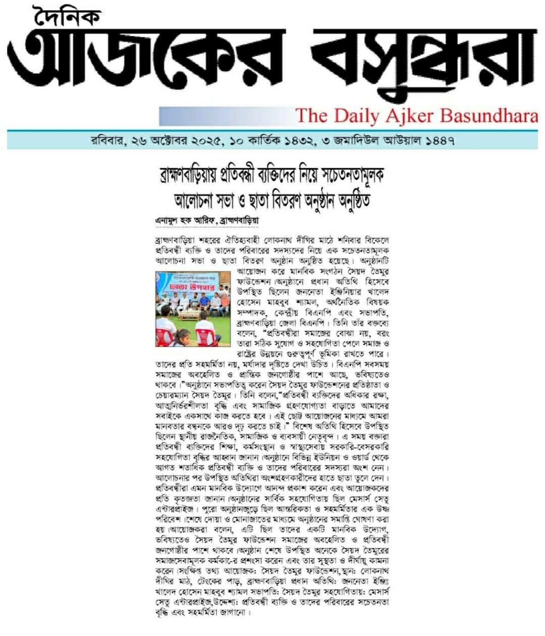 ব্রাহ্মণবাড়িয়ায় সৈয়দ তৈমুর ফাউন্ডেশনের ইফতার সামগ্রী বিতরণ