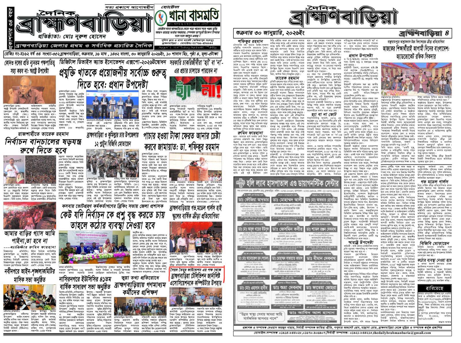 ব্রাহ্মণবাড়িয়া টেলিভিশন জার্নালিষ্ট এসোসিয়েশনকে সৈয়দ তৈমুর ফাউন্ডেশন এর পক্ষ থেকে উপহার হিসেবে ডেস্কটপ কম্পিউটার প্রদান করা হয়েছে। বুধবার রাতে ব্রাহ্মণবাড়িয়া…